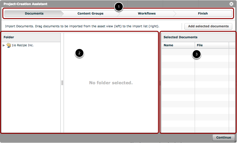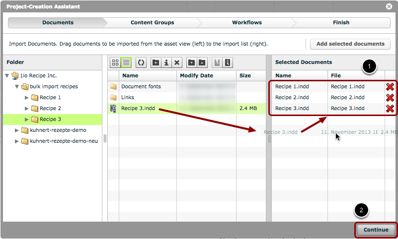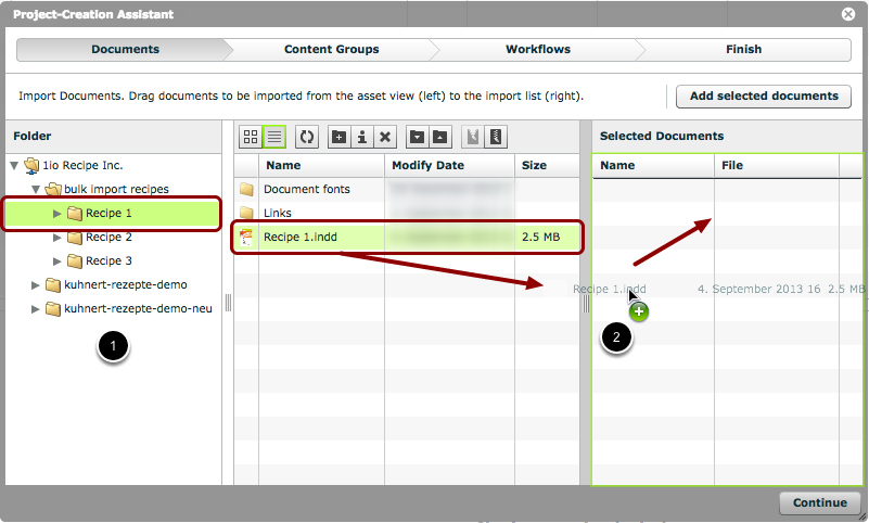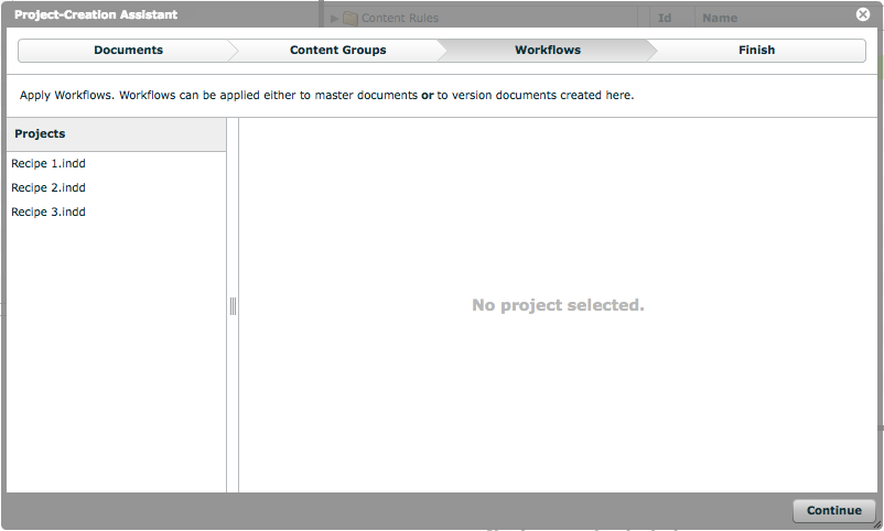 The 'Project-Creation Assistant' allows an administrator to import multiple InDesign® documents at the click of a button. Furthermore, it allows the administrator to set up content groups within those imported master documents, assign content to the content groups, create version documents, and assign and start workflows on those versions.