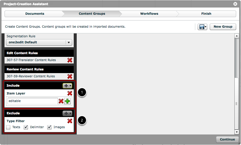 If you do not use filters here, then all of the document content will be added to the content group. If multiple content groups exist without filters, then all of the document content will be added to the first content group (i.e. the one on the left).