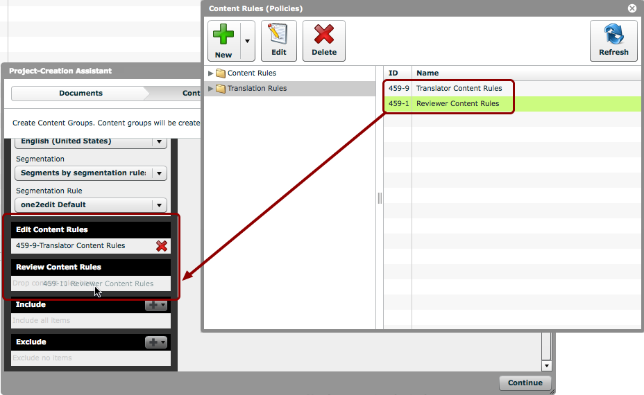 Drag and Drop content rules from the 'Content Rules (Policies)' window as you would when setting up a content group in any master document.