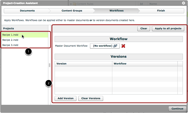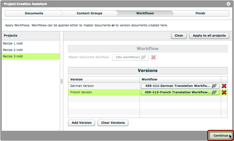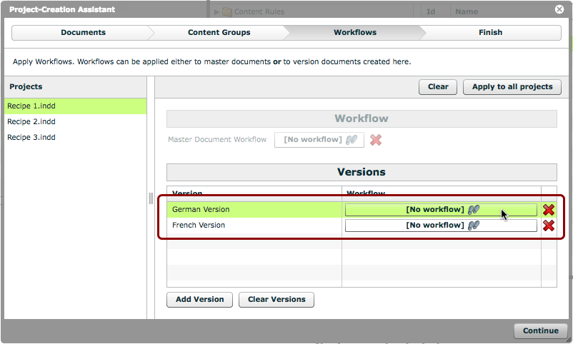 If desired, you can now click the 'Apply to all projects' button. This will duplicate the version names and workflows across all the master documents on the left.