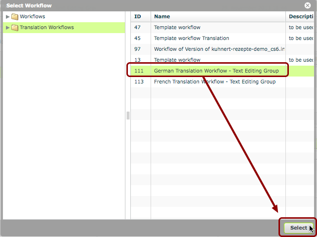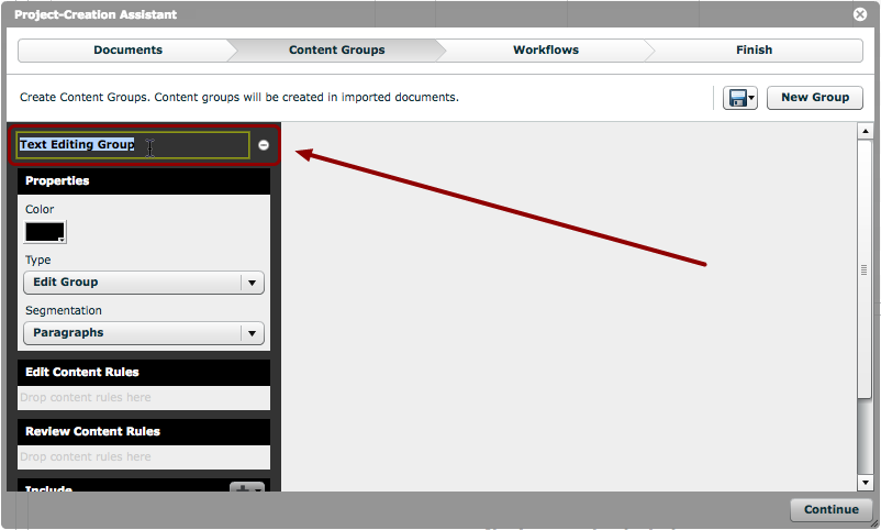 The workflows chosen must contain workflow tracks with the correct content group name. In our example, the workflows must contain a workflow track entitled 'Text Editing Group' because this is the name given to the content group earlier on.