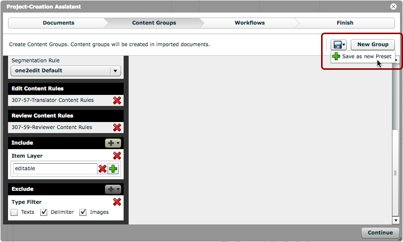 You can save your content group settings as a preset for the next time you want to use the Project-Creation Assistant.