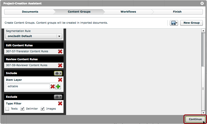 The net result of the filters in our example is that everything which isn't an image or a delimiter on the 'editable' layer, i.e., all text segments on the 'editable' layer, will be added to the content group.