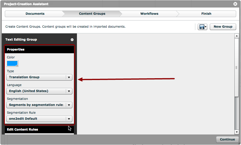 In this example, we are setting up a translation group for US English document, and segmenting the document according to the one2edit™ Default segmentation rules.