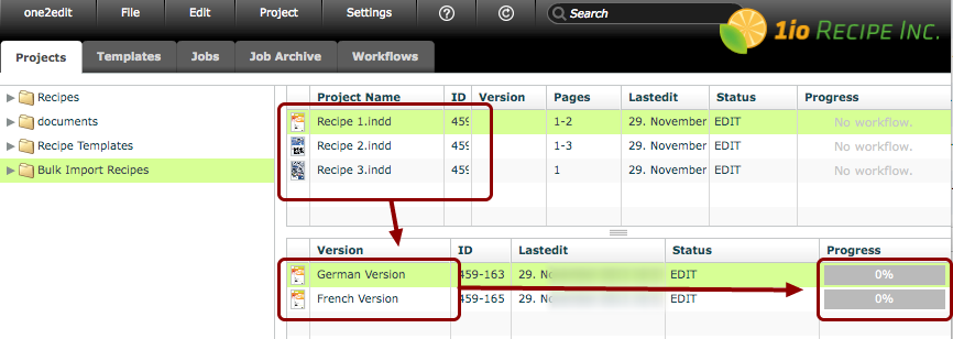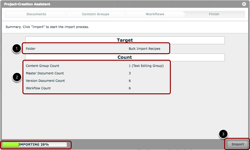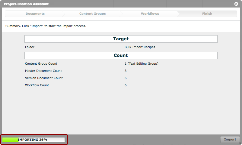 In our example above, we have 1 content group, 3 master documents, 6 version documents (2 per master document), and 6 workflows (1 each per version document). These projects will be created in the selected folder entitled 'Bulk Import Recipes'.