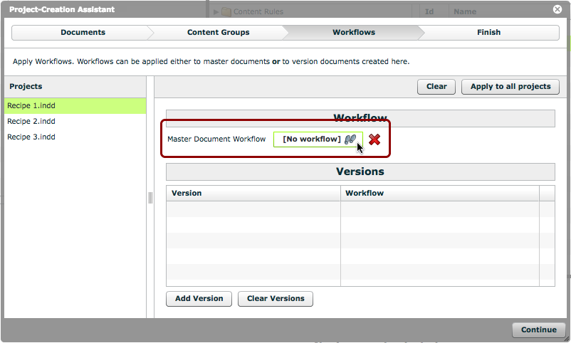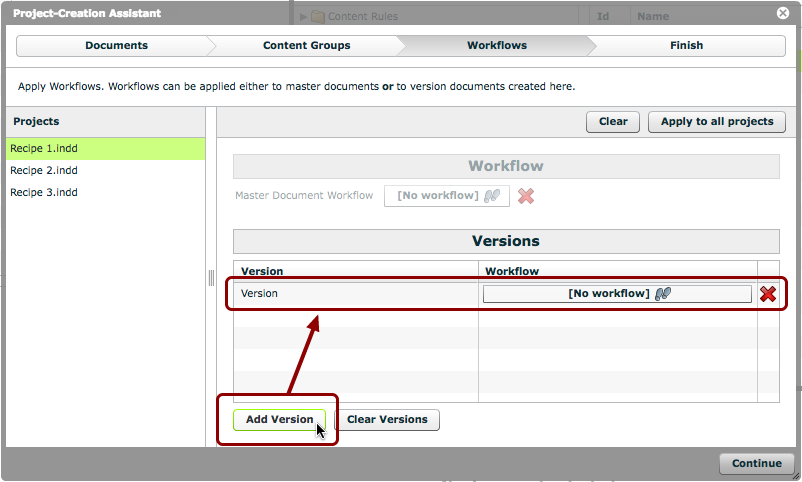 In this step, you can set up what version documents should be created for each project, and what workflows to apply to those version documents.