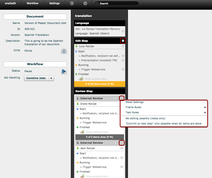 2. If the 'Job Handling' is set to 'Split Jobs', however, then the user will see an individual job for every workflow step. In this case, the user may only progress content through one workflow step at a time, e.g., even if a user is assigned to both the 'Edit' and first 'Review' steps, then any content marked as 'Done' in the 'Edit' step will need to be reviewed via a separate job from their 'Jobs' queue.