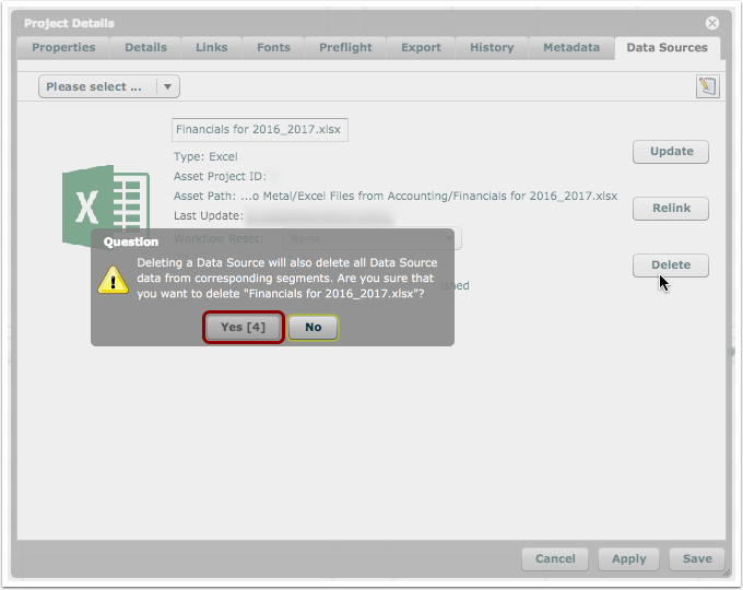If you click 'Cancel' at this point, the linked Excel file will not be removed from the project, and all links will still be present in the document. In order to fully delete the links to the Excel file, you must click 'Save' (or 'Apply').