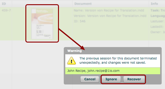 A warning message pops up, informing you about the recovery session. Click 'Recover' to restore all changes that have been made to your document before the session was interrupted or 'Ignore' if you do not want to keep any changes from your last session.