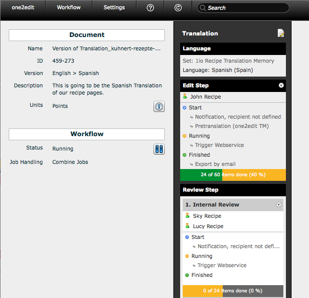 In this example, Lucy Recipe will now have visibility of the Internal Review job, and when the Edit Step is 100% complete, a document will be exported by email.