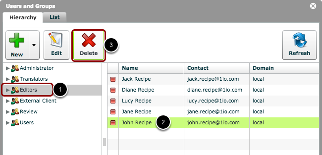 1. Select the group from which you want to delete the user, e.g. the 'Editors' group.