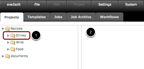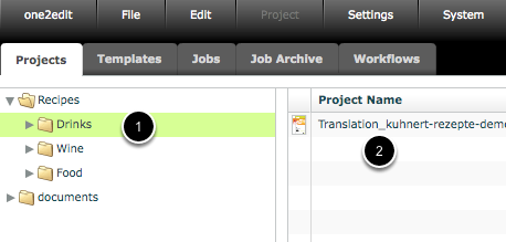 A selected folder is always highlighted (1) and its content listed on the right-hand side of the 'Projects' tab (2).